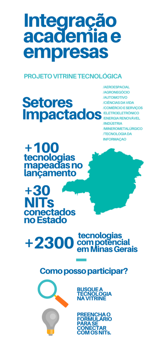 Você conhece o projeto Vitrine Tecnológica? Lançado em junho deste anos, o projeto Vitrine Tecnológica tem como objetivo aproximar o setor acadêmico com o privado, garantindo, desta forma, a diversificação econômica. A iniciativa é da Fundação de Amparo à Pesquisa do Estado de Minas Gerais (Fapemig), com apoio da Secretaria de Estado de Desenvolvimento Econômico de Minas Gerais (Sede).